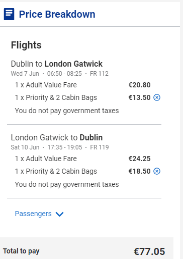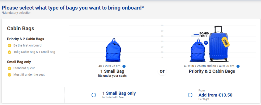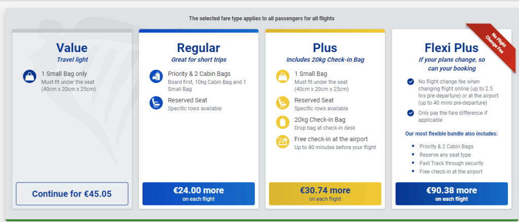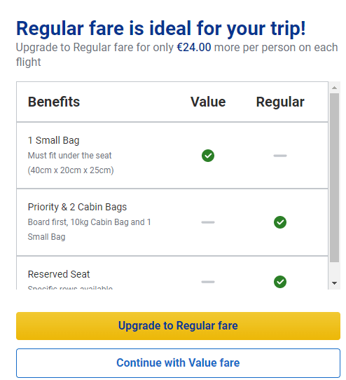 A opção REGULAR você pagará mais €24 cada voo (no caso desse voo que escolhi), então serão €48 no total que serão acrescidos no valor da sua passagem aérea (ida e volta) e você poderá levar uma mochila pequena embaixo do assento e uma mala de cabine de 10kg.